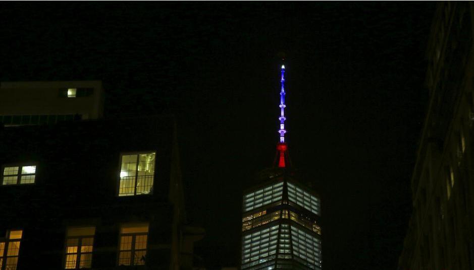 美国纽约世界贸易中心点亮蓝白红三色灯为法国巴黎系列恐怖袭击遇难者致哀。