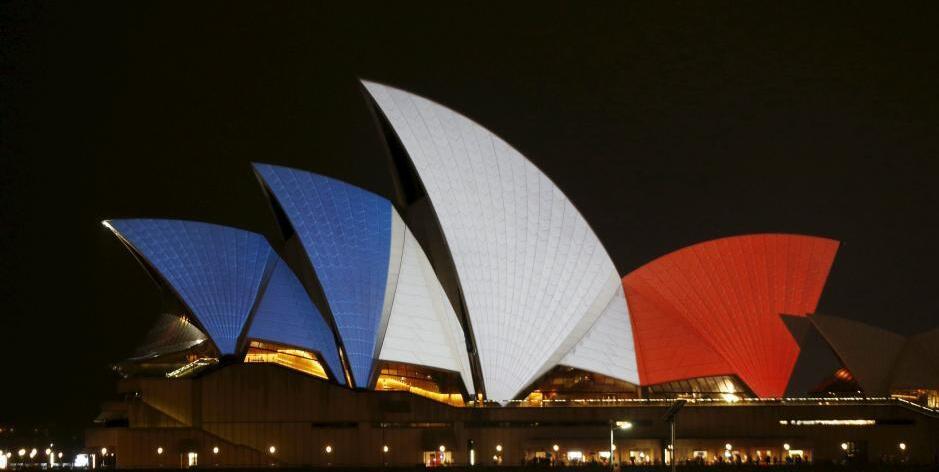 澳大利亚悉尼歌剧院披上了红白蓝三色,为巴黎默哀。