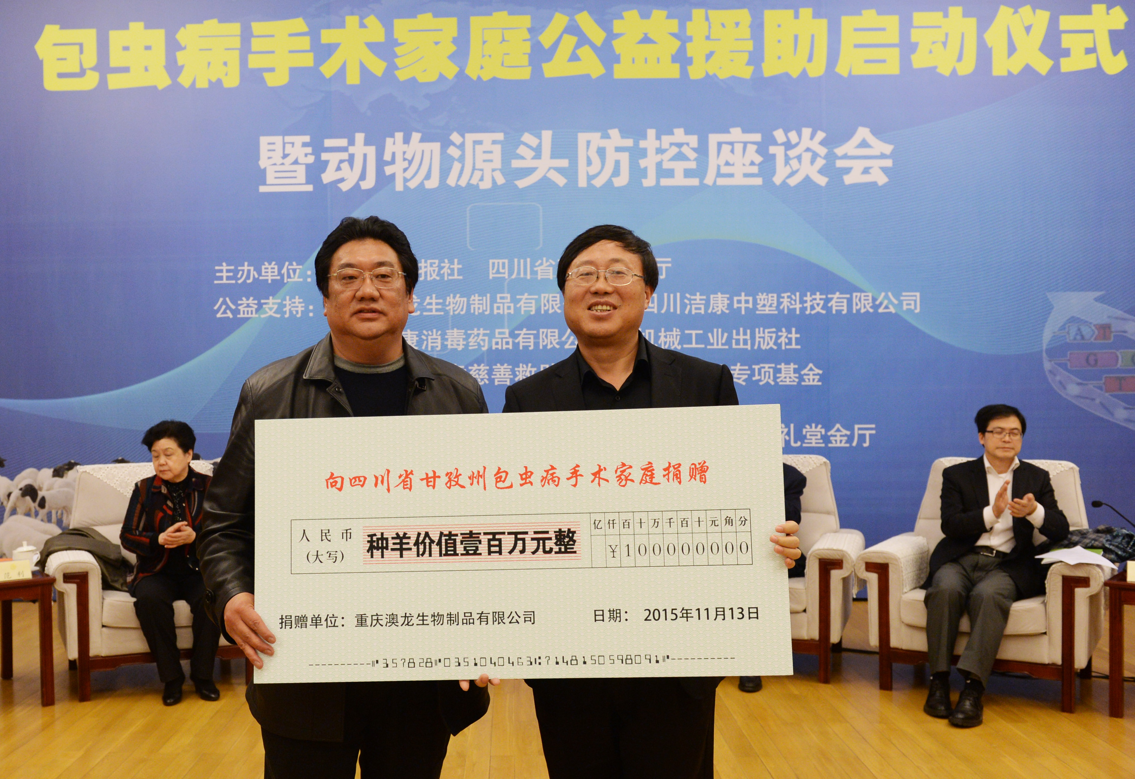 为了帮扶甘孜州包虫病贫困家庭,重庆澳龙生物制品有限公司向该州石渠县色须镇50位包虫病手术家庭捐赠了价值100万元人民币的种羊,每个家庭9只母羊,一只种公羊;四川洁康中塑科技有限公司、四川洁康消毒药品有限公司向该州捐赠了价值40万元人民币的羊毛衫和30万元人民币的床上用品;中华少年儿童慈善救助基金会祝福宝贝专项基金向该州捐赠了善款10万元人民币;机械工业出版社向该州捐赠少儿图书3000册,价值6万元人民币。