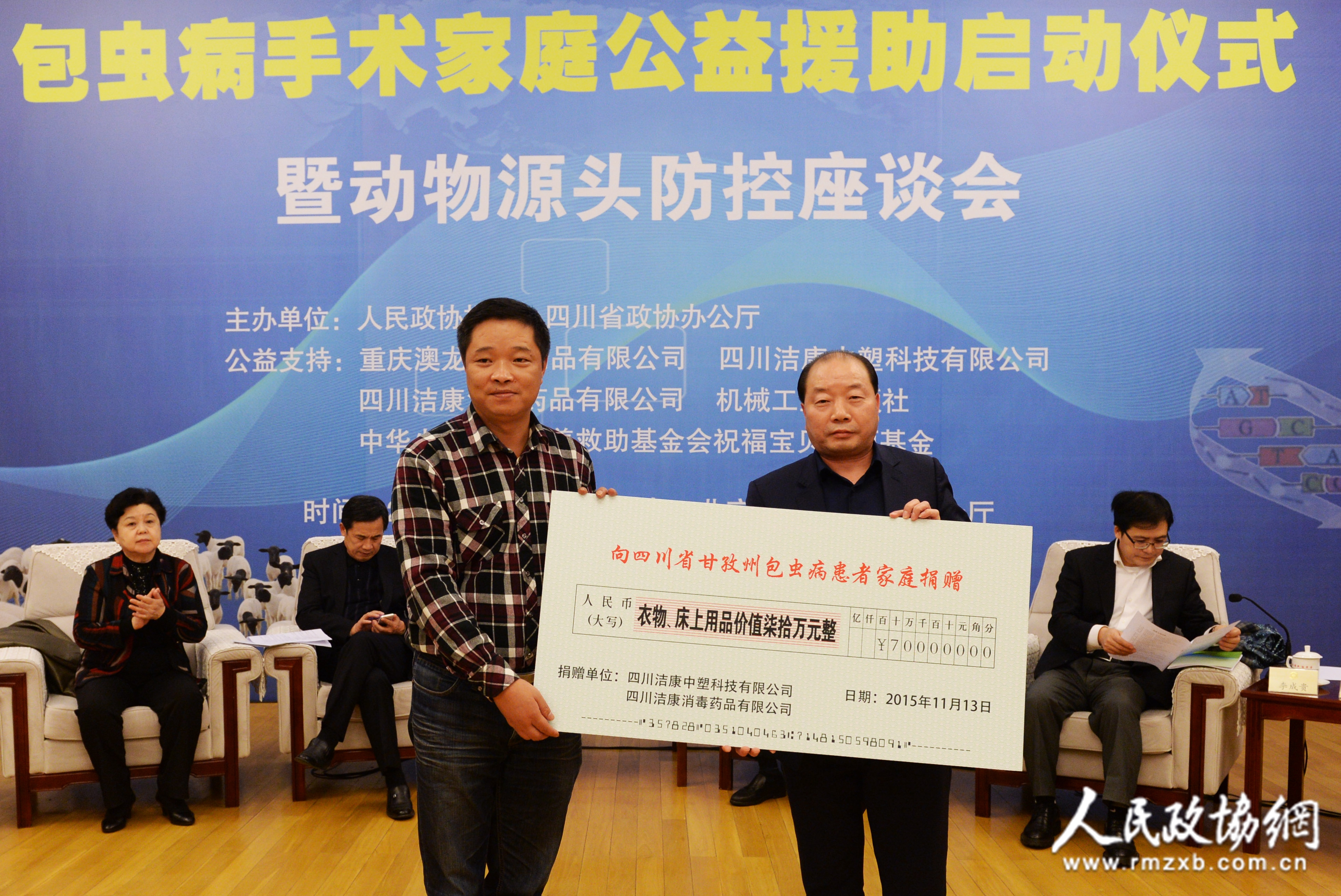本报/网讯(记者李木元)由人民政协报社、四川省政协办公厅联合主办的包虫病手术家庭公益援助启动仪式暨动物源头防控座谈会11月13日在京举行。以重庆澳龙生物制品有限公司为代表的5家爱心企业向包虫病流行比较严重的四川省甘孜藏族自治州捐赠了价值近180万元的种羊、衣物、床上用品和儿童图书以及10万元现金。座谈会上,委员专家表示,目前我国包虫病防控形势依然比较严峻,亟须从动物源头加强防控,完善规划,加大投入,并设立动物包虫病防控专项资金。