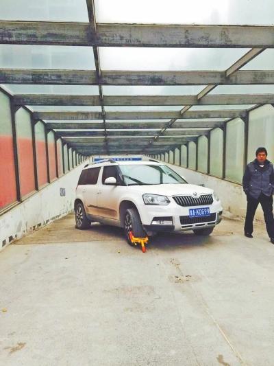 这辆车号为豫AK0G99的白色斯柯达越野车,停泊在郑州市长江路仁恒上元小区西门地下停车场出口通道(如图),它的后轮被砖垫着,右前轮落锁。车后,一辆黑色轿车被堵难以前行。
