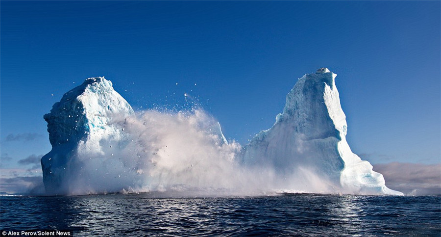 近日,一名摄影师在格陵兰附近的海面上拍摄到了一座近50米高的巨大冰山垮塌的瞬间,场面震撼。