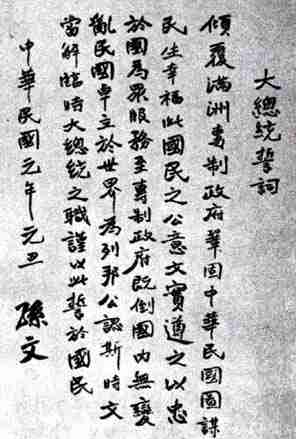1912年1月1日,孙中山在南京宣布就职,成立中华民国临时政府。此为《大总统誓词》。民国时期当选总统都要进行宣誓,而新中国则在近期规定,新当选的政府首长要向宪法宣誓,来表明宪法在人民中的地位,以及依法治国的理念。从文中可以看出,当时已经提出政府“图谋民生幸?!?、“为众服务”。也可以看出当时革命势力的软弱,“至专制政府既倒,国内无变乱,民国卓立于世界,为列邦公认”,这时,“文(孙文)当解临时大总统之职”。在任职的时候就想着辞职的事情,也只有在那个时代才有的事情吧。