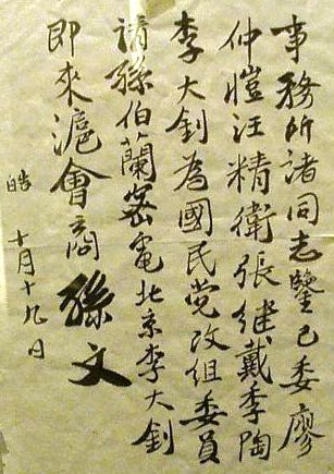 1924年,在苏俄的帮助下,国共第一次合作,中国共产党以个人身份加入国民党,从而帮助孙中山改组国民党。这是孙中山写的手信,主要内容是要请李大钊来上?;嵘淌乱?。那个时期很多共产党早期领导人都成为了国民党党员,并且进入了当时的国民党中央。毛泽东同志也成为了国民党中央宣传部代理部长。但好景不长,随着孙中山的逝世,国民党各派的日益“反动化”,最终第一次国共合作失败。