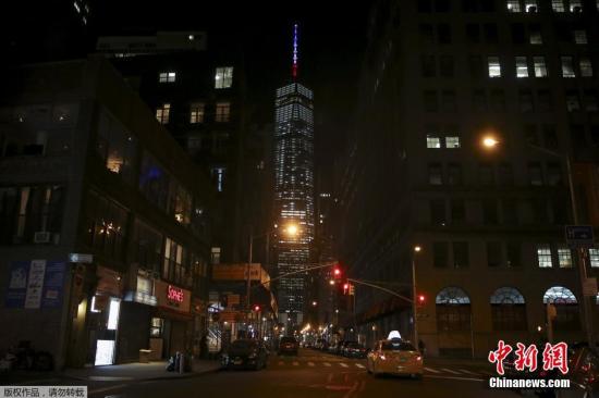 当地时间11月13日,美国纽约世界贸易中心点亮蓝白红三色灯为法国巴黎系列恐怖袭击遇难者致哀。