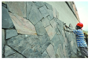 在施工现场,记者看到,工人们依照设计要求,先要把一片片料石用电锯切割成大小、厚薄相当的片石,再进行修整,然后一片片用水泥等黏合到酒店的外立面,用锤子轻轻敲打固合拼接,每块英石之间的缝隙不可过密也不可过疏,除了要拼体力外,更要有玩拼贴游戏的烧脑精神?!拔颐堑墓ぷ骺梢运凳钦欧尚寤?,看似体力活,也是技术活?!币晃怀邪趟?,工程启动以来,前后更换了十几批工程队,就是因为技术要求太苛刻。据初步估算,整个酒店的英石装饰耗材约达60000吨,园林及温泉区则高达18万吨,室内装饰耗材3000吨。
