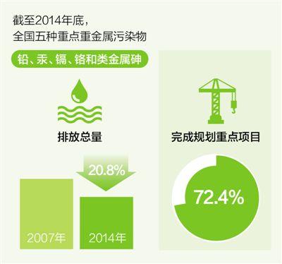 环境保护部近日公布《重金属污染综合防治“十二五”规划》2014年度考核结果:截至2014年底,全国5种重点重金属污染物(铅、汞、镉、铬和类金属砷)排放总量比2007年下降20.8%,规划重点项目完成72.4%。