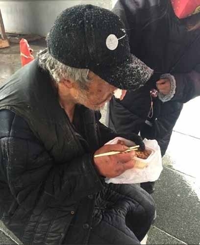 【流浪老人北京街头吃雪 好心路人买饭送衣】11月22日中午,一衣着单薄的流浪汉在西单附近上,“当时下着大雪,大家走得很快,他一动不动,我一看他正抓雪吃”。张女士和路人为老人买来水和饭,有人买来帽子和手套。记者从警方获悉,老人已被送往救助站。图为好心人给老人买来盒饭。
