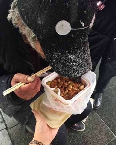 【流浪老人北京街头吃雪 好心路人买饭送衣】11月22日中午,一衣着单薄的流浪汉在西单附近上,“当时下着大雪,大家走得很快,他一动不动,我一看他正抓雪吃”。张女士和路人为老人买来水和饭,有人买来帽子和手套。记者从警方获悉,老人已被送往救助站。图为好心人给老人买来盒饭。