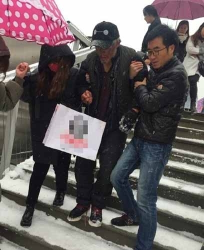 【流浪老人北京街头吃雪 好心路人买饭送衣】11月22日中午,一衣着单薄的流浪汉在西单附近上,“当时下着大雪,大家走得很快,他一动不动,我一看他正抓雪吃”。张女士和路人为老人买来水和饭,有人买来帽子和手套。记者从警方获悉,老人已被送往救助站。图为好心人给老人买衣服。