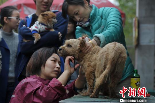 志愿者在帮忙流浪狗剪毛 张畅 摄