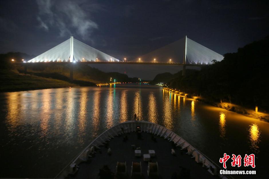 当地时间11月23日凌晨4时20分许(北京时间11月23日17时20分),正在执行“和谐使命—2015” 任务的中国海军和平方舟医院船顺利通过巴拿马运河进入大西洋,计划11月27日抵达该任务第五站巴巴多斯布里奇敦。这是和平方舟第三次通过该运河。图为和平方舟医院船即将通过世纪大桥。中新社记者 江山 摄