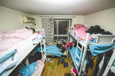 一间不足20平方米的房间里,摆了3张上下铺和一张单人床,这让7个人的小屋显得愈发拥挤了。 本报记者 王伟伟摄