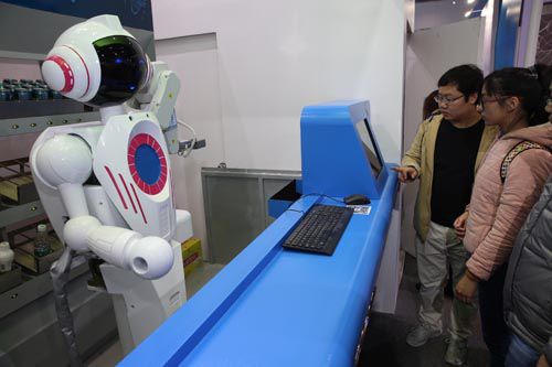23日,在2015世界机器人大会上,售货机器人在进行展示。观众只要投入一定金额就能购买货品。