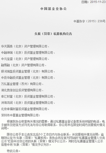 从今年9月29日起,基金业协会实施“失联(异常)”私募机构公示制度,当出现一些情形后,将会被认定为“失联(异常)”机构。