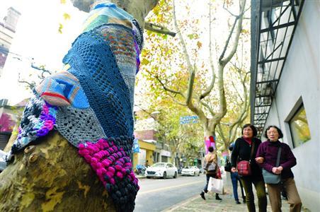 黄浦区几棵大树近日在微信朋友圈上走红:和其它光秃秃迎风颤抖的大树不同,它们被爱心人士披上了彩色的毛衣,这种温馨的画面引来很多人“点赞”。
