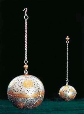 在物理学中,要使一个具有一定重量的物体不倾斜翻倒,最佳的方法是采用支点悬挂。银薰球就是采用了这种方法,将香盂悬挂在两边各有一个轴孔的内持平环中,当内持平环呈水平位置时,香盂因自身重量,可以前后轻微晃动而不会左右倾斜翻倒。但仅用一个持平环是无法避免香盂向轴向方向倾斜翻倒的。为解决这一问题,必须在轴向再做一个较大的持平环,将悬挂香盂的内持平环悬挂在外持平环上,并使两环的轴孔正好垂直,轴心线的夹角为90 度。因此内持平环能避免香盂前后方向倾斜;外持平环则能防止香盂(包括内持平环)左右倾斜。盂心随重心作用,始终与地面保持平行,无论薰球怎么转动,盂内的香料都不会撒出,可置于被中或系于袖中。银薰球的这种结构完全符合现代航空航海中使用的陀螺仪原理。