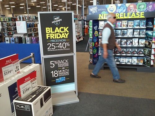 一周前,工业市百思买(Best Buy)电器连锁店,就在店门口竖起黑色星期五优惠价格标志牌,标明现在就开始Black Friday价格,购买部分电器可享受25%-40%的优惠,且还有5%返款及18个月分期付款优惠。