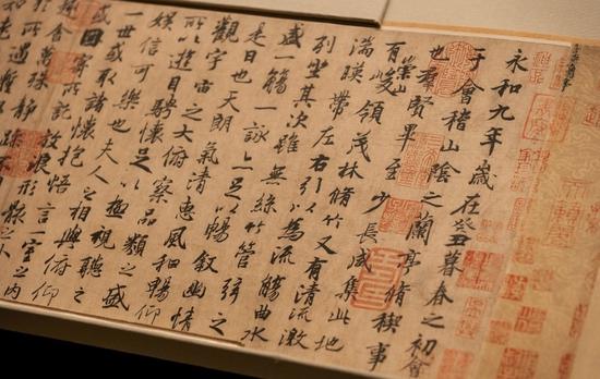 唐朝神龙年间冯承素版的手摹《兰亭序》,近期在故宫博物院举办的《石渠宝笈》特展中出现。再看一下现场是什么样吧。