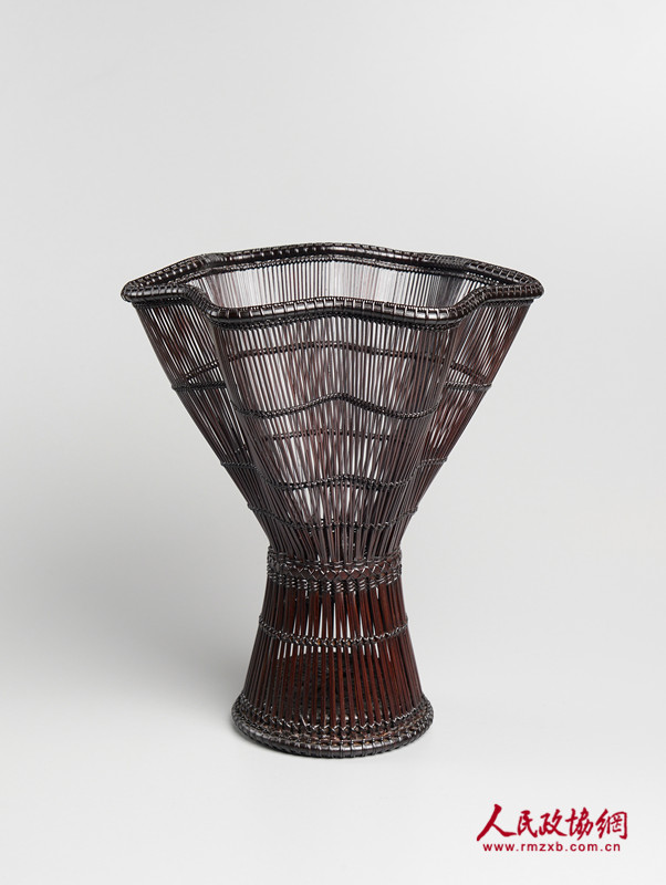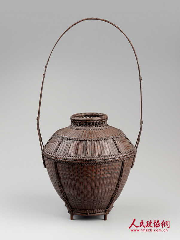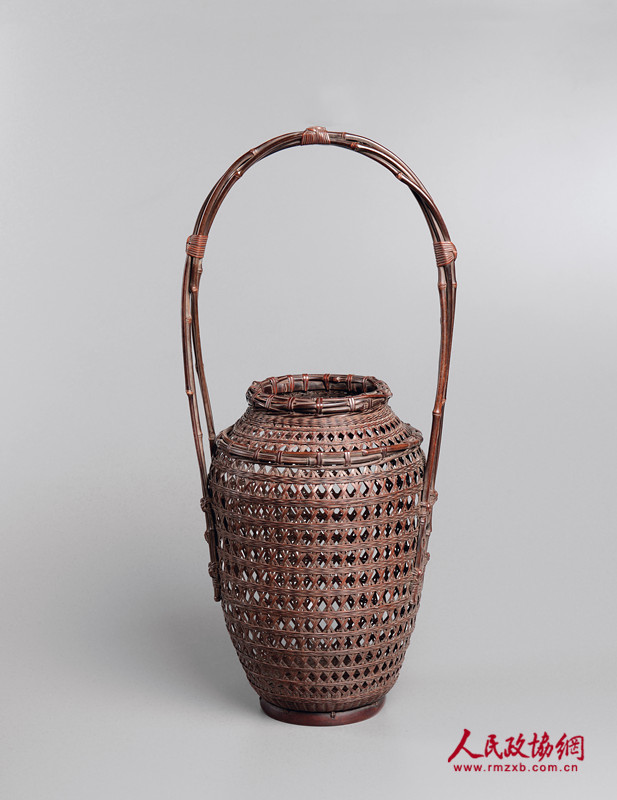 此件花器为唐物风格,传承中国之编织工艺,整体以草席编织法、当缘编织法组合制成,提梁以单片竹篾制成,以四支原竹制作成立足,花器上更使用特殊技法制作成鱼形,寓意年年有馀。
