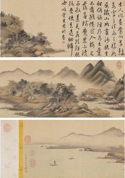 在古代资源稀缺的当下,“澄道--古代绘画夜场”精心臻集二十余件历代名家扛鼎力作:清宫内务府主管赫奕《烟树山亭》收录于《石渠宝笈》初编,曾贮于御书房,并由康熙御笔亲题广加赞许,当年由溥仪以赏赐溥杰之名出宫。恽寿平《艳秋图》以少见的恭笔大幅写秋菊繁茂,曾经郭葆昌收藏,又入藏美术布鲁克林博物馆三十余年。佚名《御苑市朝图》构图命意,与《清明上河图》有异曲同工之妙,可谓是带有北宋全景式构图的南宋早期宫廷职业画家的作品;董其昌《书画合璧册》原系朵云轩旧藏,书与画兼美,三经出版;崔子忠、董其昌《洛神赋书画合璧卷》文质彬彬,难能可贵;王鉴《仿子久秋山图》曾为咸丰间孙毓汶鉴藏,雅逸高古,一派清润气象;王翚《摹古山水册》取赵承旨、关仝、黄公望、王蒙、李唐、唐寅、王维各家画法,为金望乔、陆心源递藏十分难得。