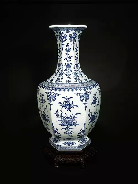 明清瓷器专场中,清三代的瓷器拍品数量增加,官窑精品涵盖青花、粉彩、仿古瓷、御题诗瓷器、唐英造瓷等,与明代永乐、宣德之甜白釉、青花齐聚,佳作迭出。其中明永乐“青花缠枝莲菊卷草回纹盘”、清乾隆时期的仿古瓷器“青花折枝花果纹六方瓶”、“仿哥釉双耳尊”、“仿汝釉六方贯耳瓶”等官窑精品值得关注。
