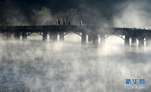 11月25日,游客在云雾缭绕的江西庐山花径景区的九曲桥上欣赏美景。