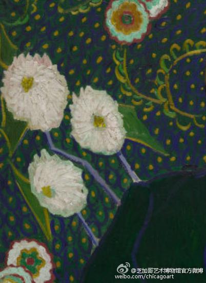 背景远看仿佛是深蓝色的底色,但近看其实是梵高运用了大量深蓝色的短曲线,驻足在画面前欣赏片刻,会有种背景花纹似水波流动的错觉。