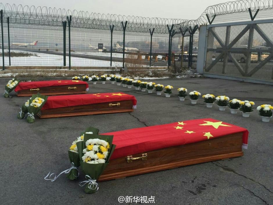 据新华社“新华视点”微博11月27日报道,历经20个小时飞行,搭载三位在马里恐怖袭击中遇害的中国铁建员工遗体的飞机27日下午到达首都机场。简短的接灵仪式上,工作人员为灵柩覆盖国旗,同事亲友向英灵献花。万里之行,他们魂归祖国。让我们记住他们的名字:周天想、王选尚、常学辉。记者 樊曦 摄 图片来源:新华视点
