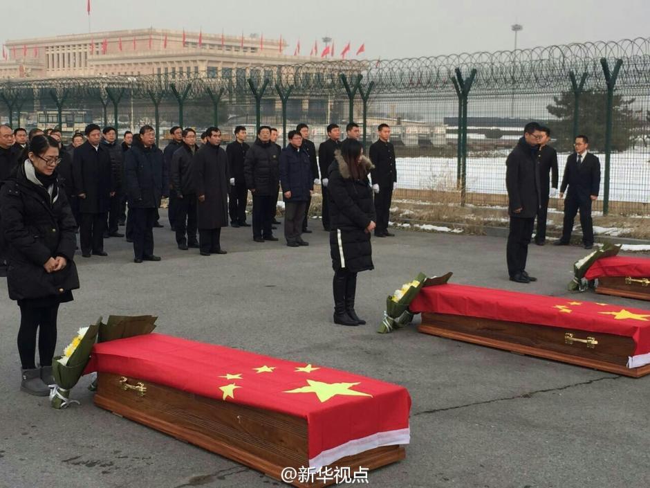 据新华社“新华视点”微博11月27日报道,历经20个小时飞行,搭载三位在马里恐怖袭击中遇害的中国铁建员工遗体的飞机27日下午到达首都机场。简短的接灵仪式上,工作人员为灵柩覆盖国旗,同事亲友向英灵献花。万里之行,他们魂归祖国。让我们记住他们的名字:周天想、王选尚、常学辉。记者 樊曦 摄 图片来源:新华视点