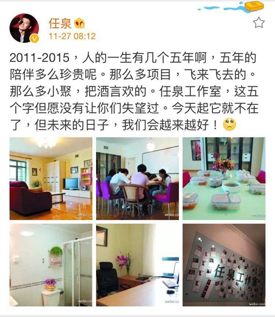 11月27日,任泉在微博上宣布任泉工作室正式解散,同时还和网友一起缅怀了这几年工作室的发展当中难忘的一些瞬间。作为最早成立的艺人工作室,任泉工作室曾经出品多部有口皆碑的电视剧:《爱情面前谁怕谁》、《笑傲江湖》、《国色天香》等。面对这样的决定,很多网友都纷纷在微博上表示惋惜。