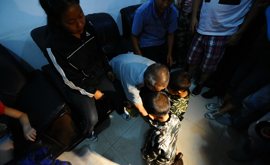 7月3日下午,从湖南来的李家人从贵阳北站赶到鹿窝乡。而邬家人,带着李艳红和两个双胞胎儿子,也在派出所的办事大厅里,等着湖南亲人的到来。两个双胞胎儿子,老大叫邬有福,老二叫邬有发,快8岁了,在鹿窝小学一年级就读。面对陌生的记者,两兄弟一点都不怯生。图为李艳红的一对双胞胎儿子见到外公就跪地叩头。