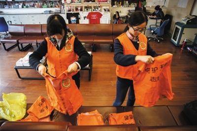 11月27日,北京地坛医院内的红丝带之家。两位大学生志愿者在整理印有“守护天使”字样的志愿者背心。