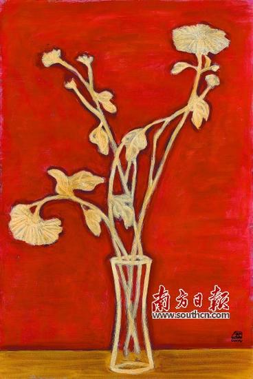 常玉1940年代的作品《黄桌上的菊花瓶》。