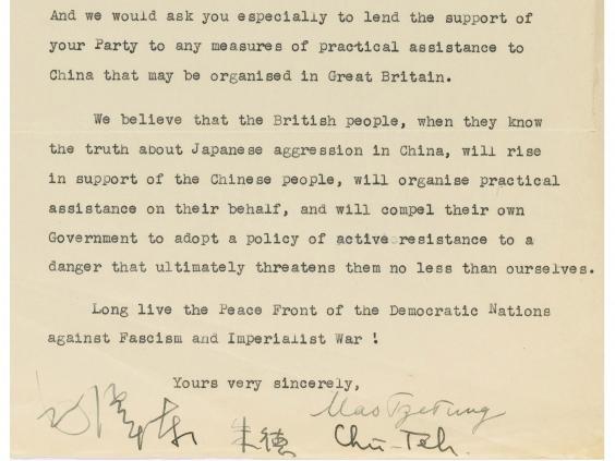 这封信发自延安,记录了中共领袖与西方政要最早的沟通接触。信件结尾有毛泽东和朱德的汉字签名。这封信将于12月15日在伦敦苏富比拍卖。