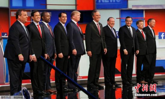 当地时间2015年8月6日,美国克利夫兰,2016共和党总统竞选人举行首场电视辩论,参加此次电视辩论的10个人分别为(左起)新泽西州州长克里斯蒂、佛罗里达州参议员鲁比奥、脑神经外科医生卡森、威斯康星州州长沃克、富豪特朗普、佛罗里达州前州长杰布布什、前阿肯色州州长赫卡比、得克萨斯州参议员克鲁兹、肯塔基州参议员保罗,以及俄亥俄州州长卡西奇。