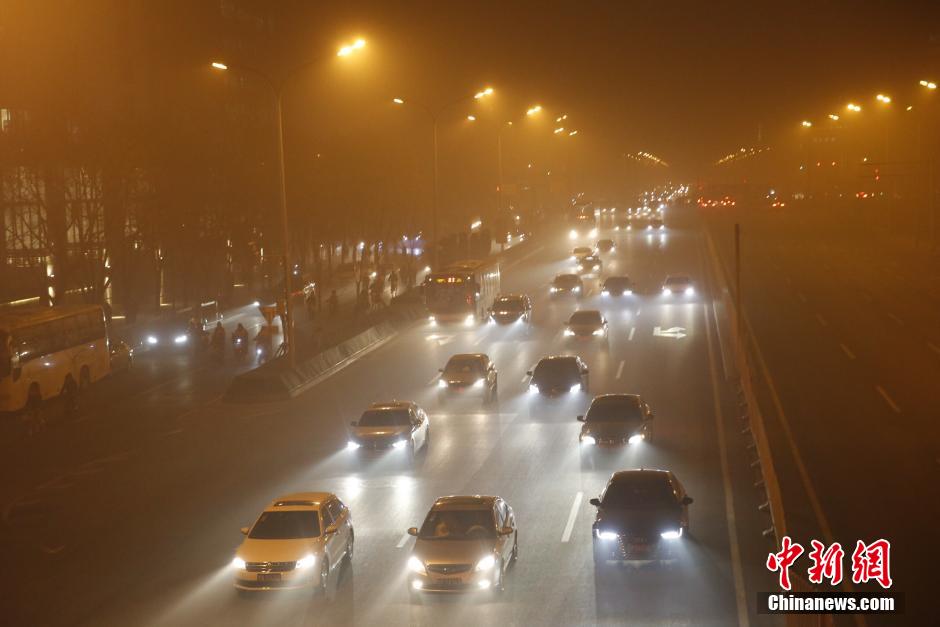 11月30日晚,北京菜市口车辆在雾霾中行驶。当日,北京现空气重污染过程,这是自今年3月31日《北京市空气重污染应急预案》修订后,首次启动橙色级别的预警,也是今年首个空气重污染橙色预警。 中新社记者 张浩 摄