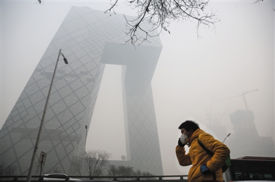 11月30日,戴着口罩的行人走过雾霾中的央视新楼。