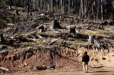 从矿场以西约三公里处开始,随车辆驶入林区深处,沿途目之所及,至少有6处林木遭到砍伐??撤ッ婊笮〔灰?,最大一处目测超过400平米,地面留有二十几段树桩和多截断口齐整的树干。