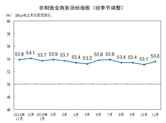 赵庆河还表示,非制造业商务活动指数上升。2015年11月份,中国非制造业商务活动指数为53.6%,比上月上升0.5个百分点,表明非制造业继续保持景气扩张态势,对稳定经济增长的作用不断增强。