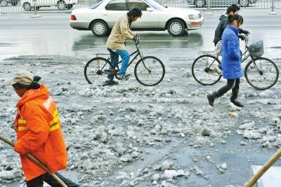 核心提示|一些环卫工将雪重新撒到了马路中间,近日,不断有郑州市民向本报反映这一现象?;肺拦っ堑慕馐褪?,为了让积雪尽快融化,但不少市民连同一线交警却认为,此举不但使本来干净的路面变湿变脏,而且也给过往的车辆和行人通行及安全带来了不利影响。