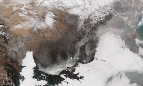 2015年11月30日,NASA发布中国华北雾霾卫星图。