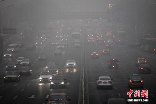 12月1日,北京市区陷入重度雾霾,白昼如夜,能见度极差。从11月27日开始,发生在华北地区的这轮大范围严重污染过程,已持续4天,为今年以来最严重的污染过程。盘踞多天的重霾,丝毫没有散场的趋势。 中新社记者 富田 摄