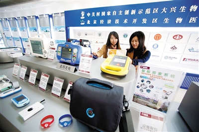 大兴生物医药基地的招商服务中心新增了医疗器械互动区域和重点项目产品展示区,工作人员正在演示医疗器械设备。