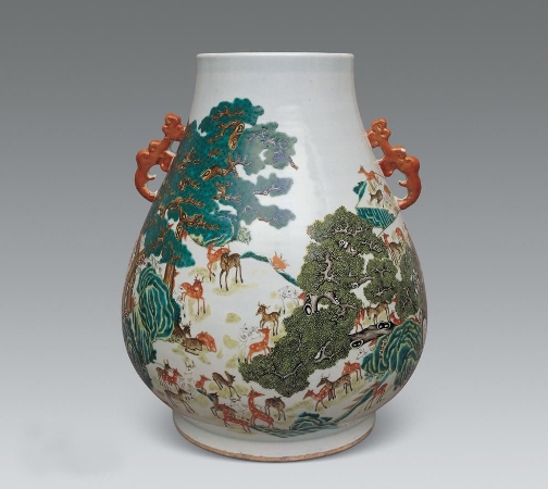百鹿尊是清乾隆早期为宫廷制作的最为华美的装饰瓷器之一。目前留存于世的百鹿尊,不仅国内的博物馆,如北京故宫、上海博物馆和景德镇博物馆中有馆藏,部分西方和日本的藏家手中,亦可觅得其踪影。多年来,它们一直被当作稀世粉彩瓷器珍藏。如此数量的百鹿尊流传于世,说明这种瓷器深得乾隆皇帝喜爱。原因显而易见:主题纹饰具吉祥含义?!鞍俾埂庇搿鞍俾弧蓖簦庵执勺鹂煽醋魇枪⑻厥獾燃逗蜕矸莸南笳?。