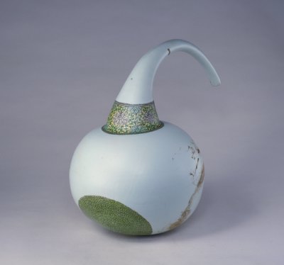 茄式壶为清康熙朝景德镇窑创烧壶式之一,为清康熙官窑所独有。茄式壶造型奇特,器呈小口,颈部细长向一侧弯曲,腹呈长茄形,圆底施釉,放置不稳。从其造型看,有人认为其当为宫廷医疗用器,也有人认为其为陈设器物。