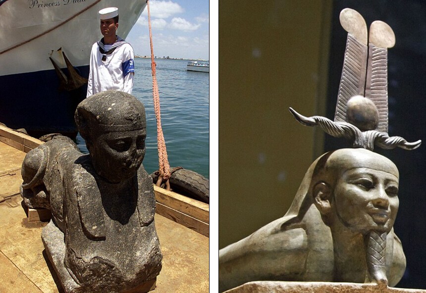 2001年,一名埃及水手正看着狮身人面像被从水中打捞出来。右图是潜水员发现的阴司判官塑像。(网页截图)