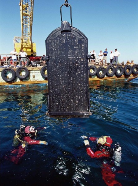 这块石碑正被小心翼翼地打捞出尼罗河三角洲。碑文上明确显示,它就被放在赫拉克利翁,尽管这座城市已经被埋入泥沙中过千年。它帮助考古学家确信,他们找对了地方。(网页截图)