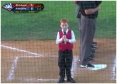 【环球网综合报道】据澳大利亚“新快网”12月3日报道,10月的一个周六,在Coopers Stadium体育馆举行的Adelaide Bite对阵Brisbane Bandits的棒球比赛前,一个叫霍尔(Ethan Hall)的7岁小男孩进行了国歌表演,但他每唱一句就打一次嗝。