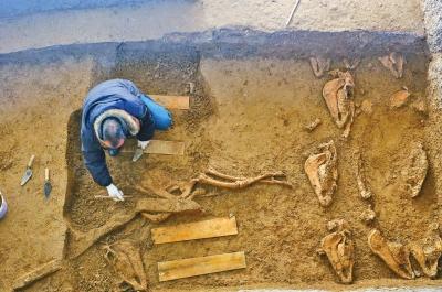 春秋陆浑戎贵族墓陪葬车马坑露真容 车上朱砂鲜艳